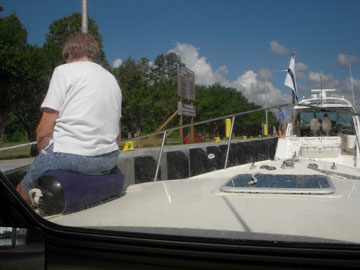 Jerri is tending the forward lines as we are raised about four feet from the water level in Albemarle Sound to the tide level of Norfolk harbor and the Atlantic Ocean. |